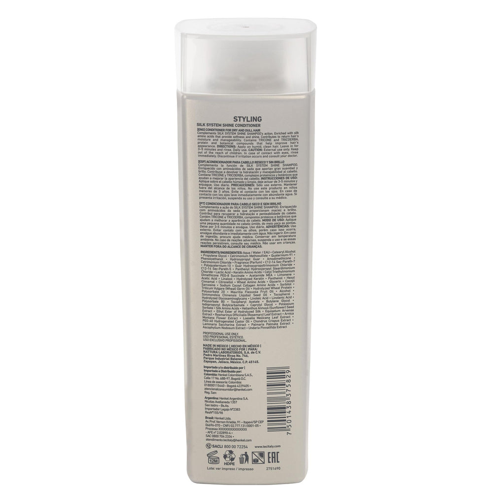 El Acondicionador Shine Silk System Shine Dimension de Tec Italy es un complemento a la función de Shampoo Shine Silk System Shine Dimension de Tec Italy. Enriquecido con aminoácidos de seda que aportan gran suavidad y brillo. Contribuye a devolver la hidratación y manejabilidad al cabello.