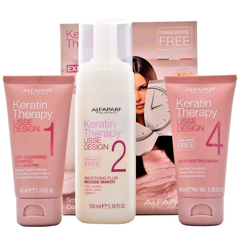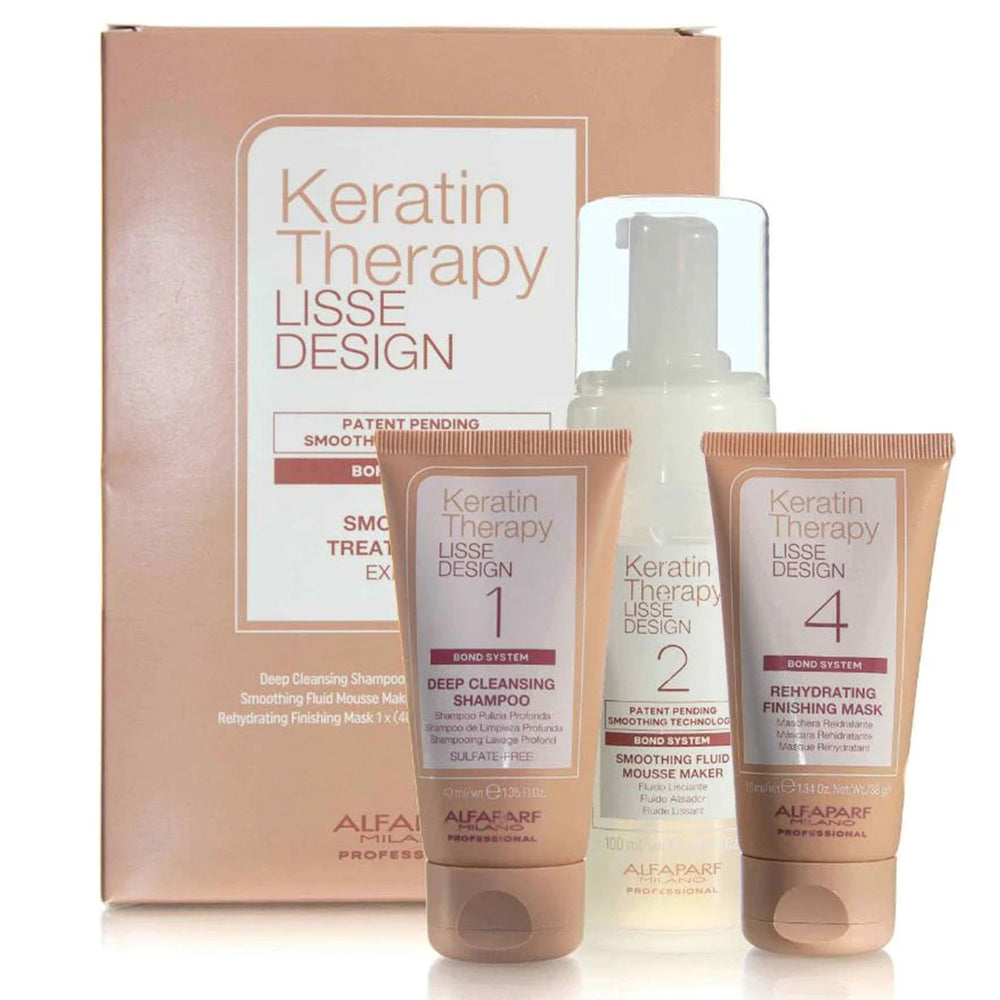 El Keratin Therapy Lisse Design Intro Kit Alfaparf Milano incluye: 1 Lisse Design Deep Cleansing Shampoo 40ml 1 Lisse Design Smoothing Fluid Mousse Maker 100ml 1 Lisse Design Rehydrating Mask 40ml