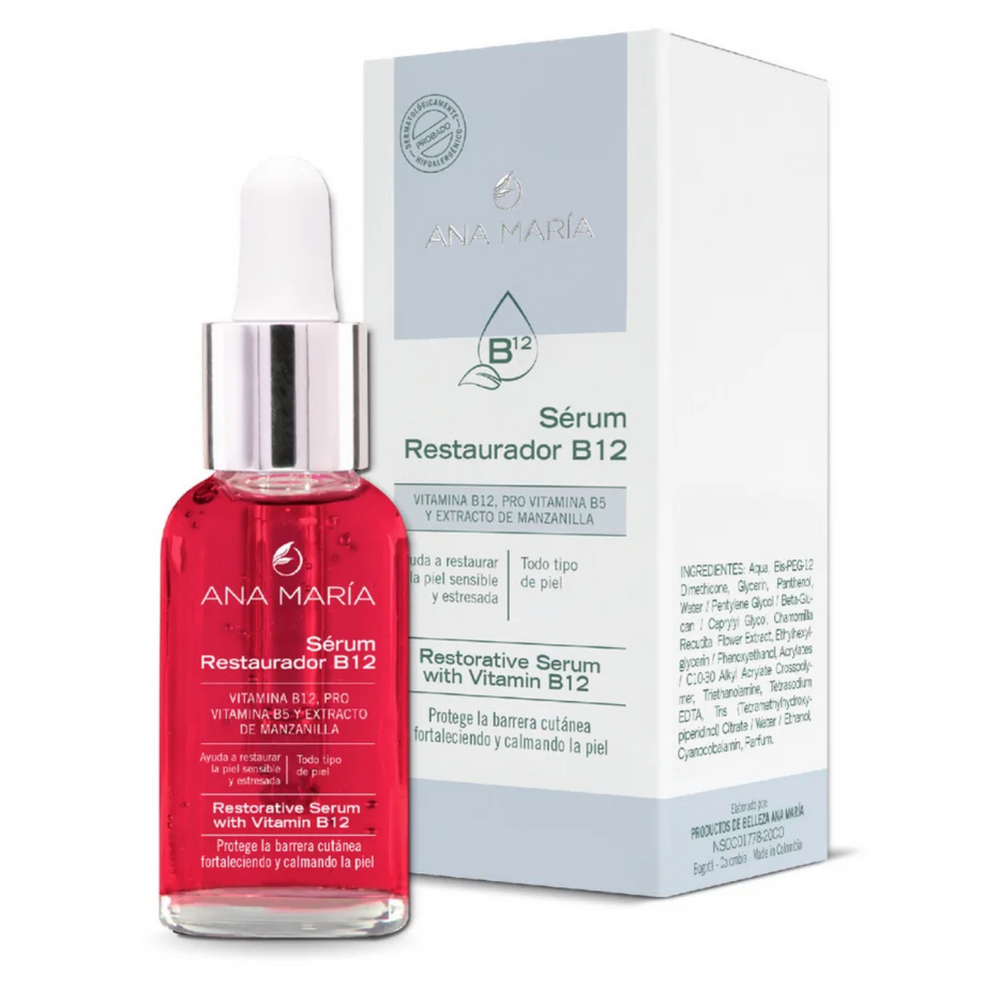 Recupera la vitalidad de tu piel con el Serúm Facial Restaurador B12 de Ana María. Su fórmula enriquecida con Vitamina B12 ayuda a restaurar la piel sensible y estresada, mientras que los Beta Glucanos de alta pureza brindan una hidratación inmediata. Además, el Pantenol y el Extracto de Manzanilla calman y suavizan, dejando la piel con una apariencia radiante y saludable.